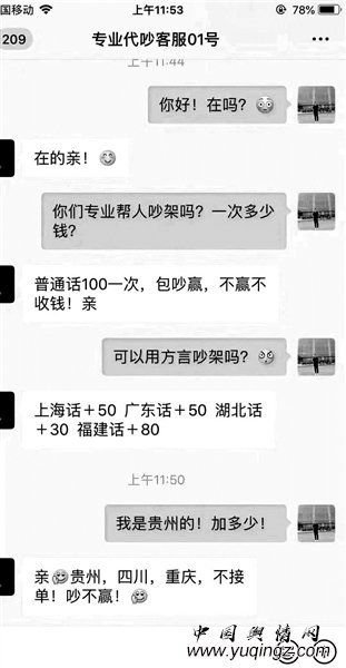 另一家标价10元代吵的则能提供更多服务内容,提供四川话和普通话“双语”服务,也可以选择文明骂人不带脏话,而且自称各种文案俱全。