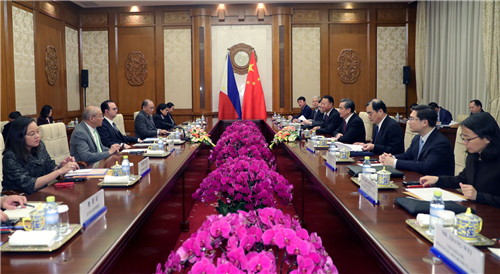 王毅说,当前中菲关系已进入近年来最好时期。这才是两个邻国相互交往的应有状态,符合两国和两国人民的共同利益,符合时代发展潮流和本地区各国的共同愿望。从2016年到现在,两国高层交往日益密切,政治互信持续增强,各领域合作全面恢复和发展,双方已签署40项合作文件,合作潜力得到迅猛释放。去年,中菲两国贸易额突破500亿美元,中国跃升为菲律宾第一大贸易伙伴,对菲投资也同比增长67%。尤其值得一提的是,去年中菲关系实现了两个“100万”,一是中国从菲律宾进口了100万吨热带水果。二是中国赴菲游客达到100万人次。这两个“100万”为两国尤其是菲律宾民众带来了实实在在的利益。两国关系之所以能取得这些成果,首先来自于两国元首的正确和有力引领。杜特尔特总统同习近平主席就发展两国关系达成一系列重要共识。中方欢迎杜特尔特总统下月来华出席博鳌亚洲论坛年会,相信此访将进一步促进两国关系发展。