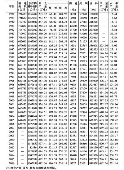 (一)粮食等主要农产品产量以及人均占有量均大幅度增加。全市粮食总产量由1978年的233.32万吨增加到2017年的405.35万吨,增长1.73倍。油料产量由1978年的16万吨增加到2017年的86万吨,增长近5.4倍。棉花产量由1978年的8090吨,增加到1982年的2.47万吨。2017年全市水果产量达到231.4万吨,比1978年13.41万吨,增长17倍。主要农产品的人均占有量也有较大幅度提高,2016年粮食人均占有量361公斤,1978年的人均占有量301公斤提高16.6%;水果人均占有量由1978年的17公斤增加到2016年的20公斤。粮、油、水果和蔬菜等农产品全面稳定增长,为人民群众的生活水平日益提高提供了物质基础。(见图2、图3)