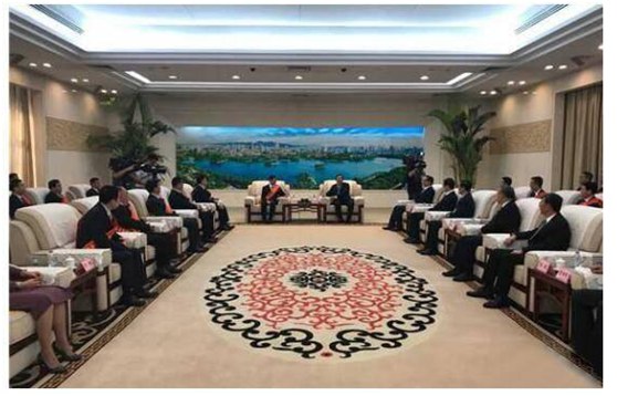 图为省委常委、济南市委书记王忠林,济南市委副书记、代理市长孙述涛会见“影响济南”年度经济人物评选获奖代表