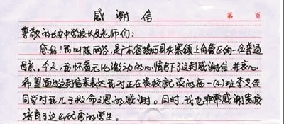 昨天下午,记者读到了这封感谢信。这封近千字的感谢信于3月18日寄达长安中学,由广东省揭西县灰寨镇上角管区老丹竹坑村一位7岁男童的母亲陈丽芬手写,讲述了该校高一(4)班学生李艾佳是怎样救助她溺水的儿子的。