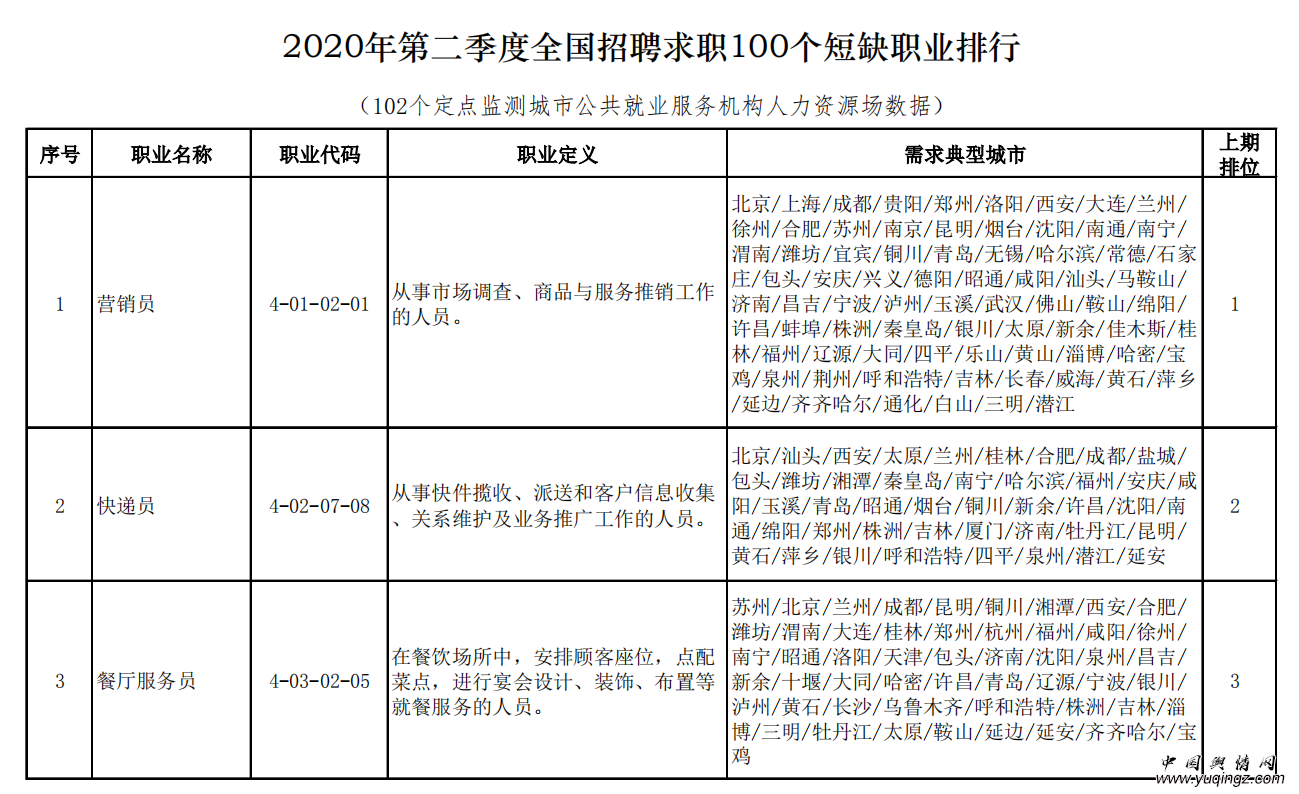 本期数据由中国就业培训技术指导中心采集各定点监测城市公共就业服务机构人力资源市场“招聘需求人数”和“求职人数”缺口排名前20的职业岗位信息,综合考量岗位缺口数量、填报城市数量等因素,经加工汇总整理形成,按“招聘需求人数”与“求职人数”岗位缺口数量和填报城市数量加权取值后从大到小排列,排在前面的职业需求短缺程度大于排在后面的职业。