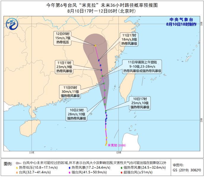 预计,“米克拉”将以每小时25-30公里的速度向偏北方向移动,强度还将有所加强,将于11日早晨到上午在福建漳浦到平潭一带沿海登陆(23-28米/秒,9-10级,热带风暴级或强热带风暴级),登陆后强度逐渐减弱。