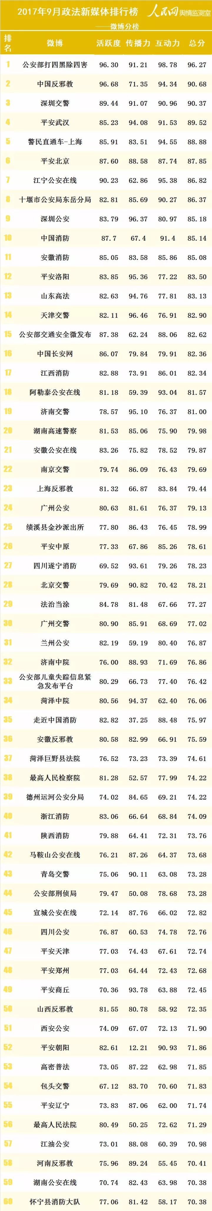 民网舆情监测室近日推出“9月政法新媒体排行榜”。在微博分榜前10名中,公安系统占据了9席,具有绝对优势。@公安部打四黑除四害依旧领跑榜单,@深圳交警、@平安武汉本月表现均较出彩,跻身前4;@警民直通车-上海因积极回应民警绊摔事件,活跃度较上月有所提升,位列第5。值得一提的是,@中国反邪教本月因“一网两微”正式上线、发起“对邪教说不”网上签名活动,活跃度大幅上升,排名上升至第2位。