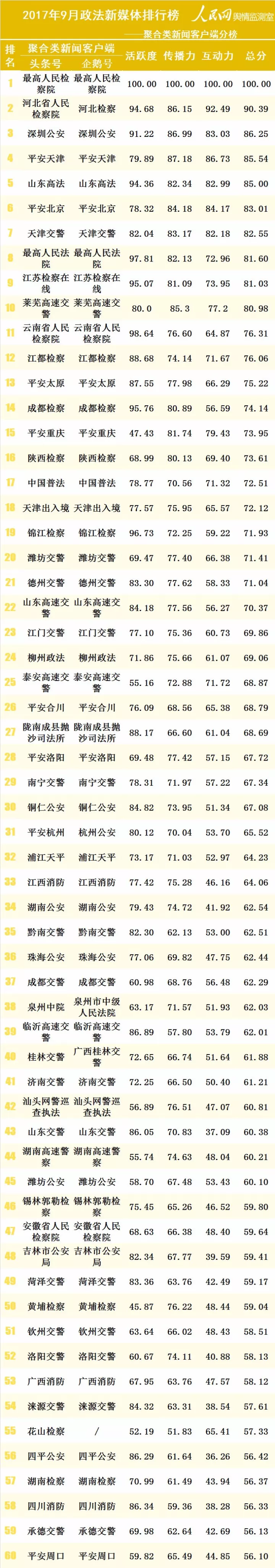 在聚合类新闻客户端分榜前10名中,公安系统仍具有优势,占据5席。“深圳公安”、“平安天津”表现优异,挺进前5;检察系统中,“最高人民检察院”活跃度、传播力以及互动力均大幅提升,获得满分,跃居榜首;“河北省人民检察院”、“江苏检察在线”表现不俗,分列第2位和第9位。法院系统中,“山东高法”“最高人民法院”表现突出,分列第5位和第8位。