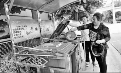 在任城区二十里铺街道大屯村,笔者见到村民马敬秀正出门倒垃圾。只见她用脚一踩,垃圾桶盖随即掀开,伴随着红外线语音提示器的提醒,餐余垃圾被投放到绿色垃圾桶内。