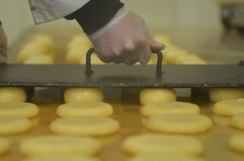 1月9日,在湖北省恩施土家族苗族自治州宣恩县万寨乡伍家台村,工人用铁片将揉成小团的原料压成糍粑。