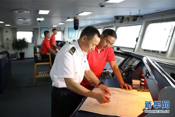 远望3号船船长倪留国(前左)等在研究和商讨航向(6月10日摄)。新华社记者 李雨泽 摄