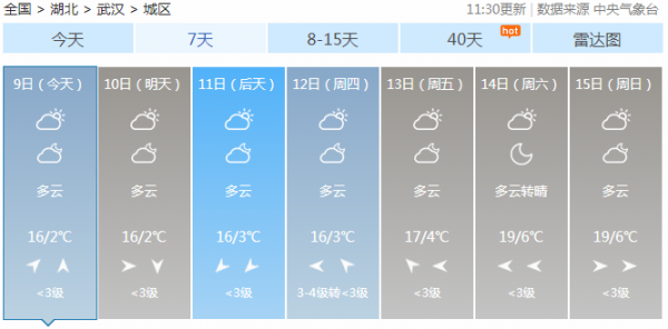 湖北省内,10日将维持晴到多云天气,大部分地区高温将达15℃~19℃。11日受弱冷空气影响,西部地区气温小幅下降,北风略有增强。