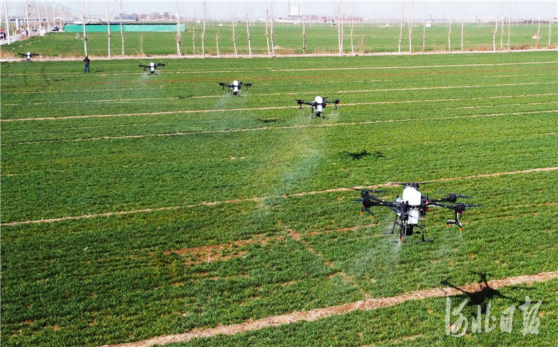 2020年3月10日,在河北省石家庄市藁城区梅花镇高玉村麦田里,藁城区丰可得农机种植专业合作社的社员驾驶操控植保无人机为麦苗进行一喷综防作业。进入春耕时节,石家庄市藁城区在落实疫情防控措施的同时,农民们抢抓农时进行田间管护,积极开展春耕生产。记者史晟全摄影报道