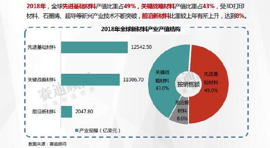 2018年,全球先进基础材料产值比重占49%,关键战略材料产值比重占43%,受3D打印材料、石墨烯、超导等新兴产业技术不断突破,前沿新材料比重较上年有所上升,达到8%。