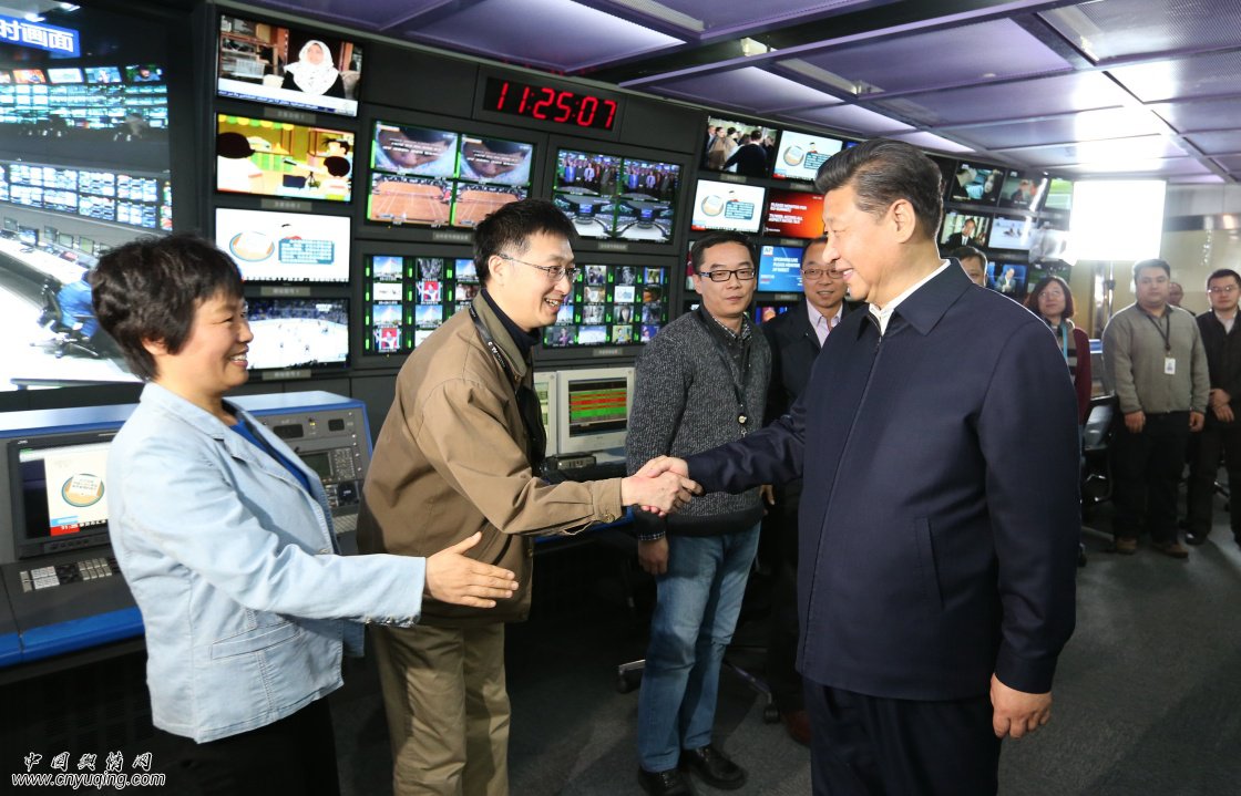 临近中午,习近平来到中央电视台。他听取中央电视台板块业务、媒体融合等情况介绍,到总控中心观看电视传播能力建设视频展示,在《新闻联播》演播室、导控室向主持人和工作人员了解新闻制作导播流程,并亲自切换按钮体验模拟播出。习近平指出,中央电视台每天面对数亿观众,一定要紧跟时代、放眼全球,多设计一些融思想性、艺术性于一体的好栏目,多创办一些脍炙人口、寓教于乐的好节目。