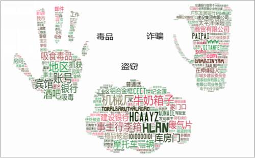 笔者所在的北京理工大学大数据搜索与挖掘团队,专注大数据语义搜索与挖掘,在知识图谱、可视化与搜索挖掘方面有十多年的研究与工程经验。团队在公安大数据方面的主要工作包括情报抽取、自动脱敏、分类、聚类、特征挖掘、关联挖掘等工作。情报抽取主要从文本表述中抽取各类案情要素,如嫌疑人姓名、身份证、性别、案由等;自动脱敏技术是将敏感信息自动替换,脱敏后的信息无法追溯到具体的个人,不再涉及公民隐私,而公安部门可以根据脱敏的对照库,实现信息还原。下图是我们利用公安某局脱敏后的15万数据自动生成的毒品、诈骗、盗窃三类警情的宏观可视化特征画像。