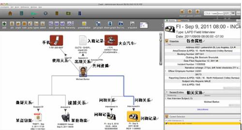 Palantir的搜索结果与百度等通用搜索引擎完全不一样,并不完全基于关键词,而是探索搜索背后的关联关系,搜索结果如下图所示。这里,中间的焦掉是搜索的嫌疑人“MichaelBarton”,通过Palantir平台,可以快速将各类庞杂的数据通过可视化平台的形式汇聚到一起,最终我们发现该犯综合立体化视图,其中包括:使用的手机,入境记录,逮捕时开的车,逮捕的案子,同时涉嫌一起盗窃案,包括已有的两次审讯记录。点击任何一个节点,右边会展示其详细的属性与其他实体的关联关系。例如,点击该车,可以展示出该车的历史所有被抓拍的照片与数据。办案人员同时可以根据关联连接一层一层往下挖,并人机互动,补充各种筛选条件,将模糊的破案线索逐步求精,最后极大的提高破案准确性与效率。